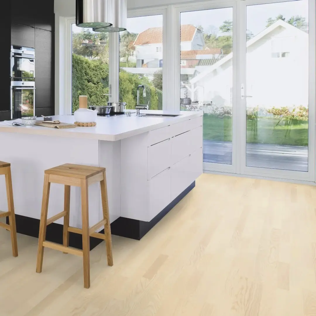 Boen Ash White Andante 3-Strip Live Matt is a 14mm engineered wood flooring that embodies Scandinavian simplicity and modern durability. Featuring a 3-strip design, it offers a dynamic, traditional pattern. The unbrushed surface provides a smooth, clean finish, while the white-toned ash wood brings a bright, airy feel to any space. Finished with Boen’s Live Matt lacquer, it delivers a subtle sheen and robust protection against daily wear. Each plank measures 2200mm in length and 215mm in width, with a 3.5mm ash wear layer for longevity. The square-edged design ensures a seamless appearance, and the 5G Click system allows for straightforward installation. Suitable for underfloor heating, this flooring combines timeless elegance with modern performance.